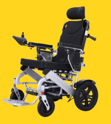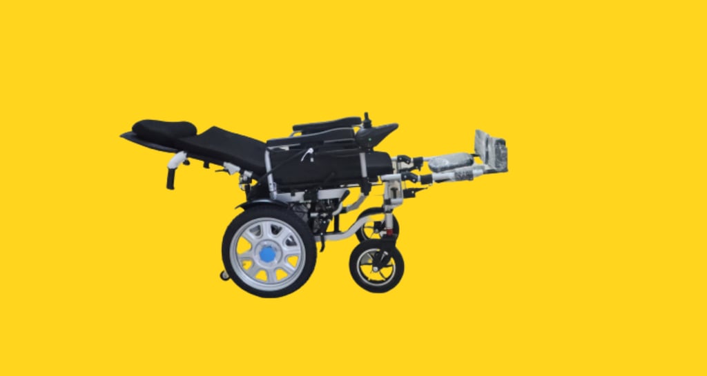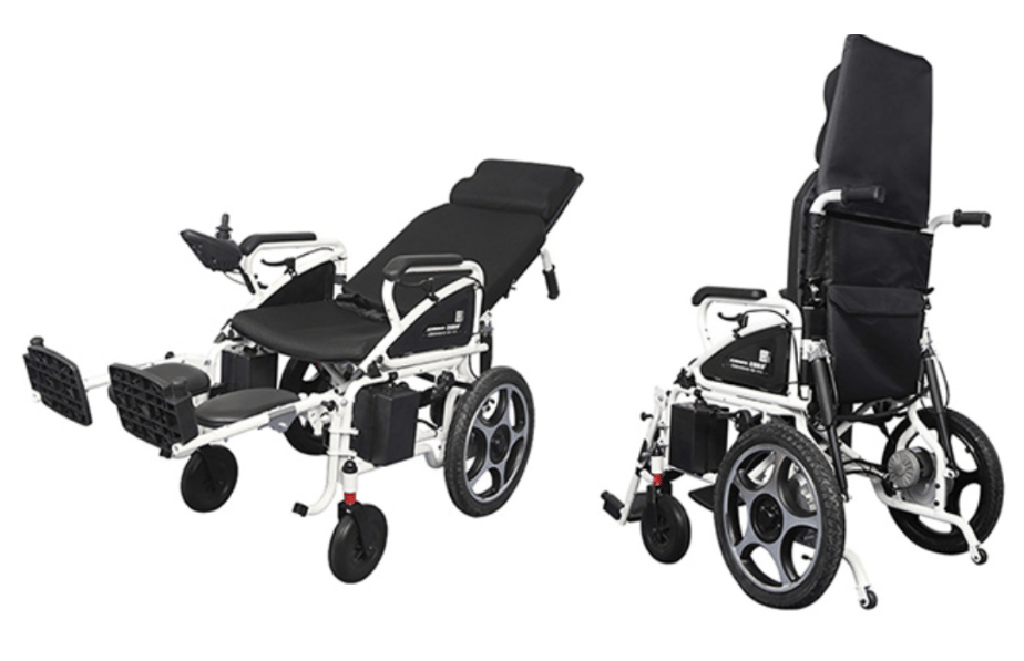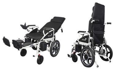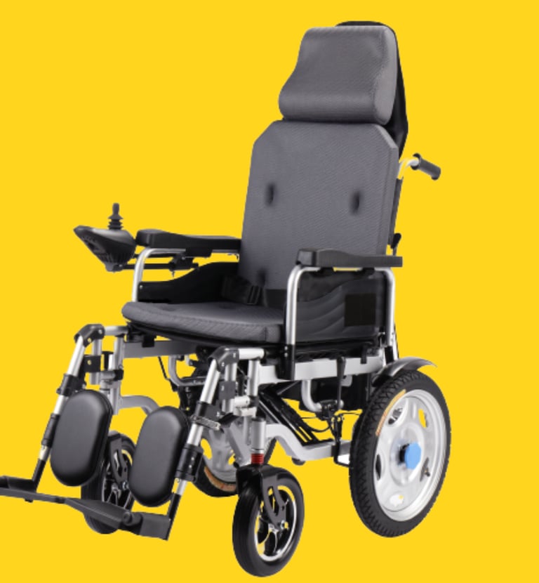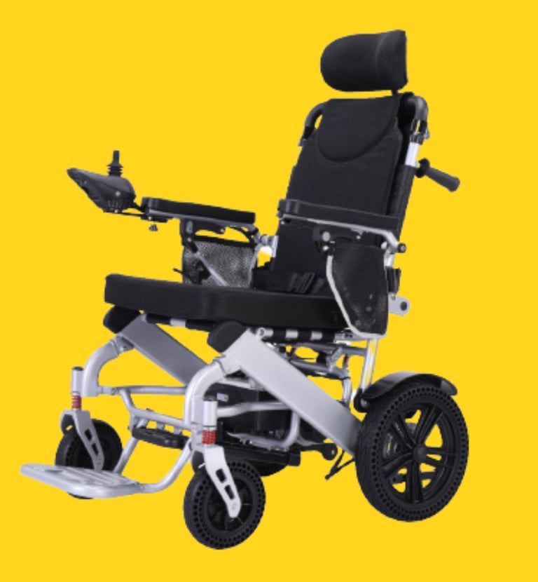 Reclining electric wheelchair with front alloy wheels 10" & rear steel wheel 16" inflammable tyre.